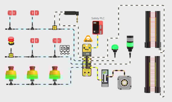 A few safety devices are easy. But once you get into long conveyors, palletizers, cells with many gates, or multiple access points, the “home-run every device back to the panel” approach explodes: